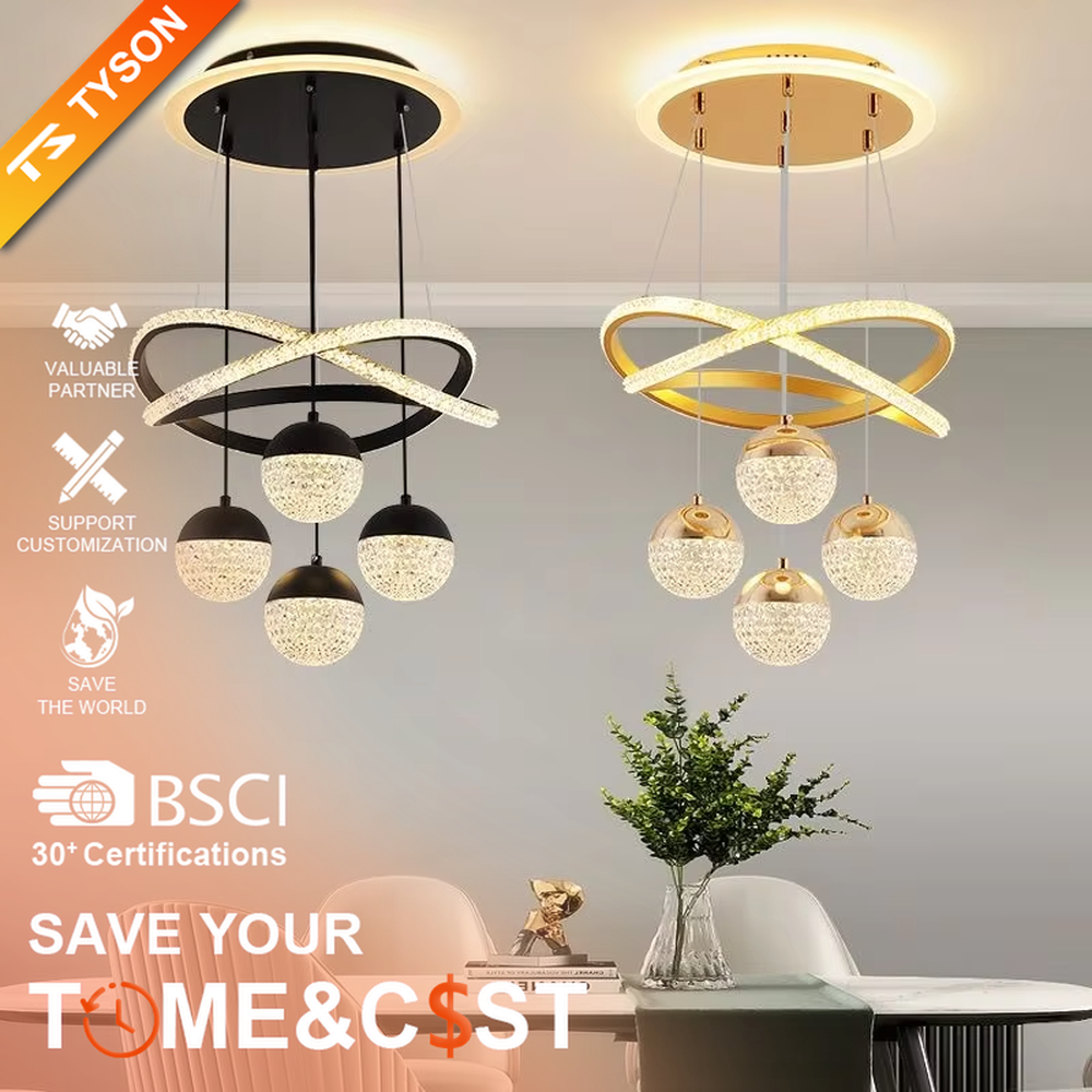 This chandelier centers on modern light luxury design, with a black metal frame creating an interlaced star-ring shape, paired with LED light strips inlaid with crystal diamonds and four spherical crystal lamp shades. Light refracts brilliant light and shadow through the crystal, featuring vivid lines and distinct layers. Combining practical lighting with artistic decoration, it not only creates a comfortable lighting atmosphere, but also becomes a visual focus in the space with its unique shape, infusing the space with light luxury texture.