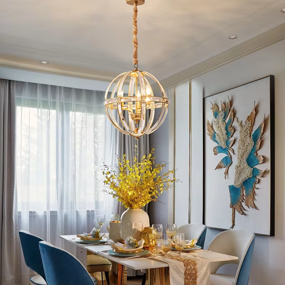 This chandelier centers on modern light luxury design, with a multi-layer interlaced spherical frame made of gold metal, paired with transparent crystal/glass material. Light refracts soft and brilliant light and shadow through the material, featuring an exquisite and layered shape. Combining practical lighting with artistic decoration, it not only creates a warm lighting atmosphere, but also becomes a visual focus in the space with its unique spherical shape, infusing the space with light luxury texture.