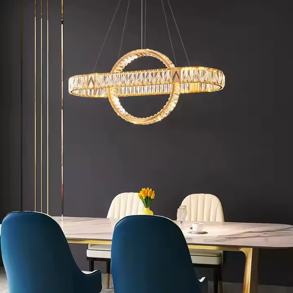 This chandelier adopts a combination of long strip and ring shape design, with a golden metal frame paired with a large number of transparent crystal decorations. The overall style is light luxury and luxurious, and the light through the crystals presents a brilliant and gorgeous effect. It serves as both a space lighting fixture and a decorative piece, creating a high-end light luxury space atmosphere.