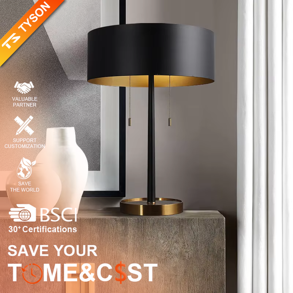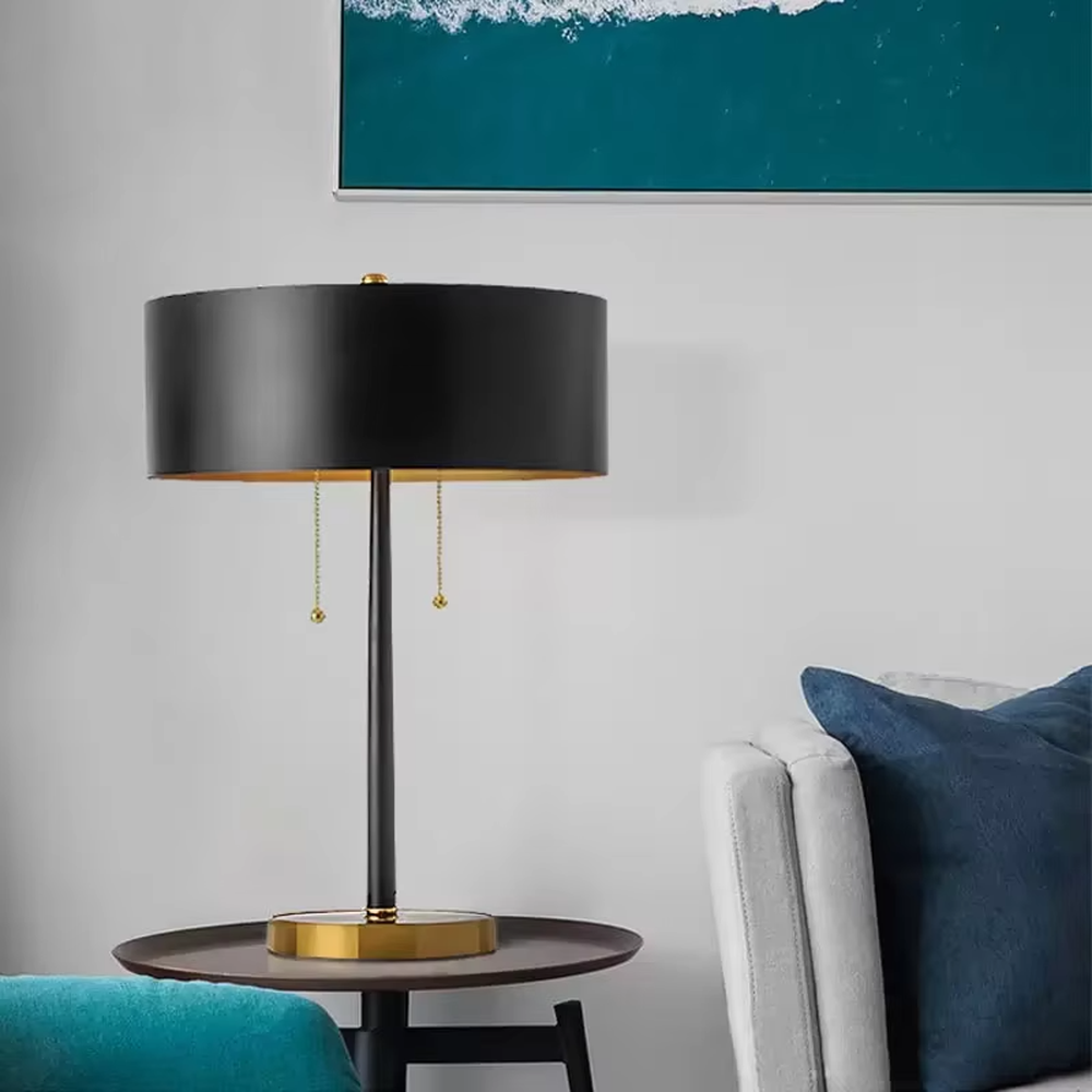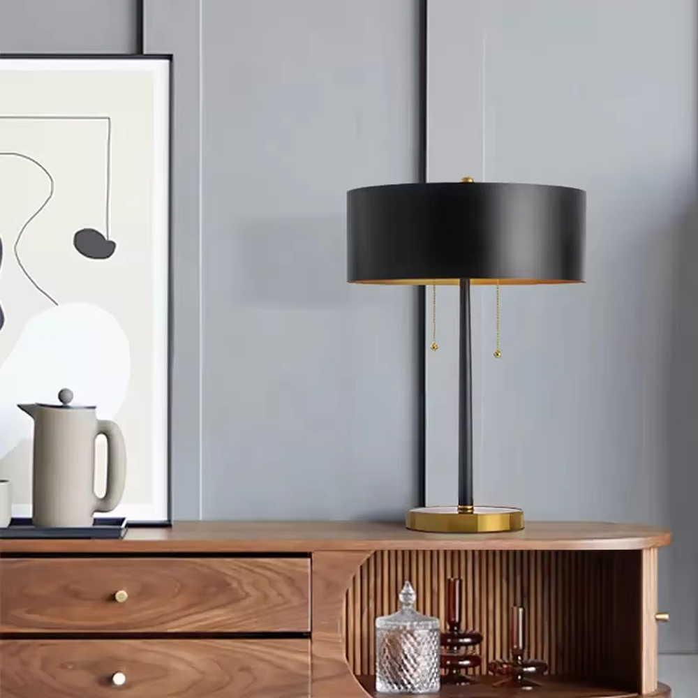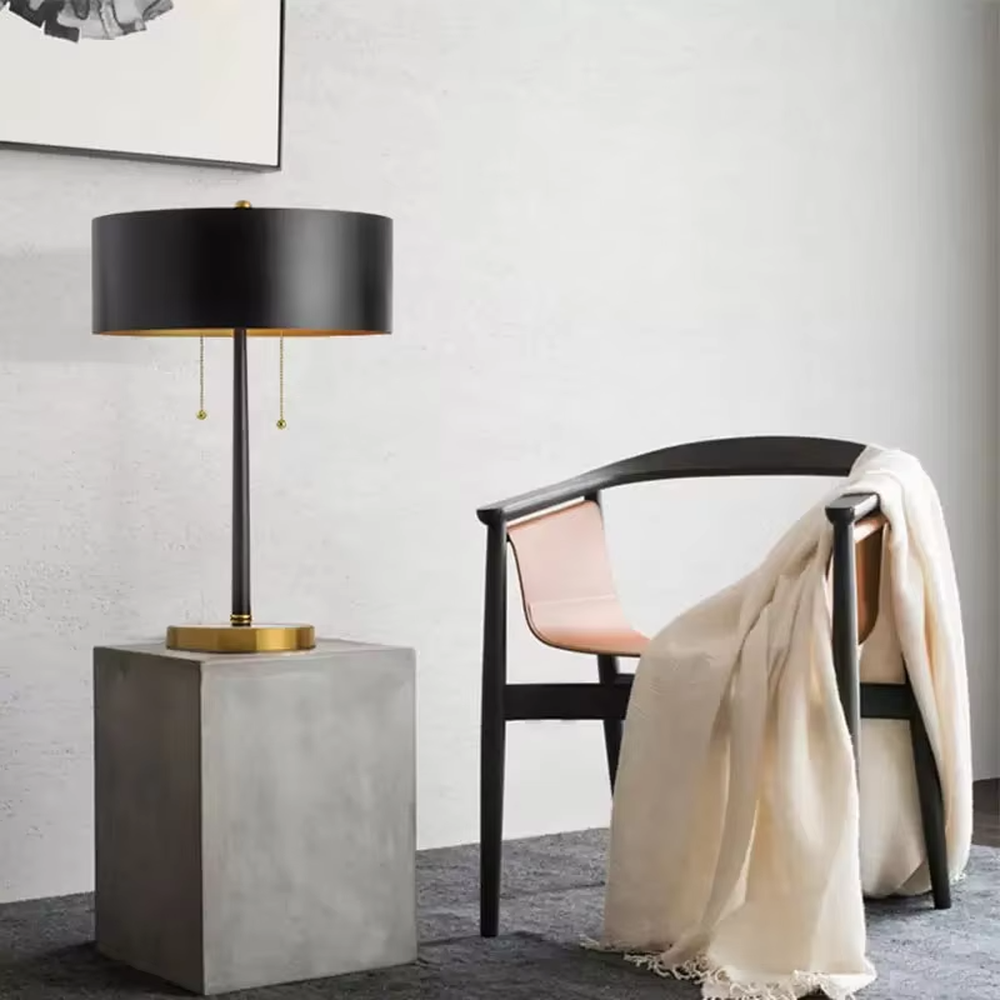 This table lamp features a black silk cylindrical lampshade, paired with a black lamp pole and golden base, and embellished with a golden drawstring switch. The design is simple, grand and high-quality, with soft and stylish lighting. It serves as both a local desktop lighting fixture and a decorative piece to create a light luxury high-end space atmosphere.