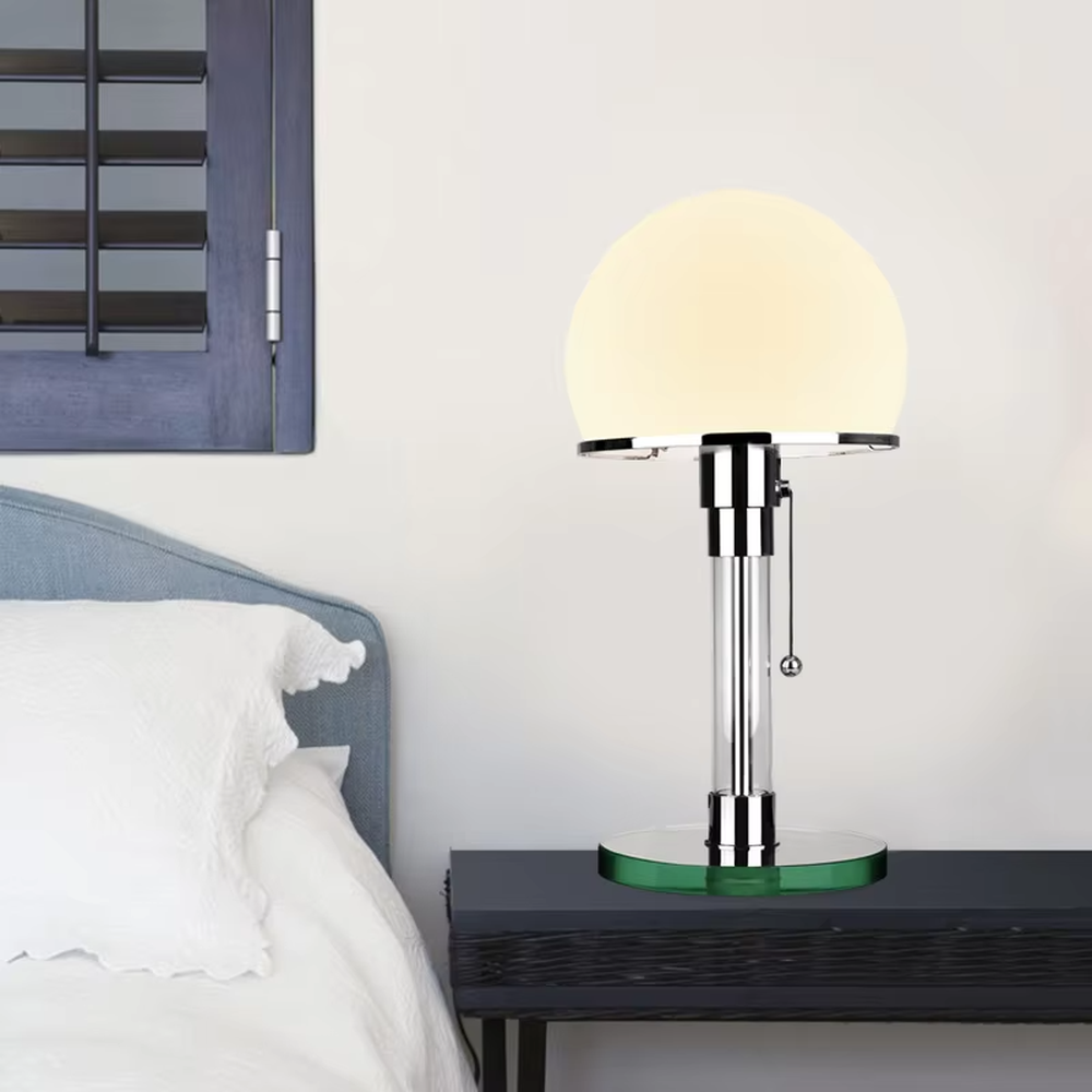 This table lamp adopts a modern minimalist style design, with a glossy chrome-plated metal stand and base, paired with a milk-white spherical lampshade, and equipped with a classic pull chain switch; when lit, it presents a soft warm light effect, and the light diffuses evenly through the spherical lampshade, suitable for minimalist home spaces such as bedrooms and living rooms. The overall shape is fresh and neat: it is both a practical desktop lighting tool and a decorative highlight in minimalist spaces, effectively enhancing the fresh and minimalist style of the space.