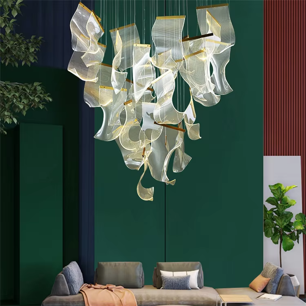 Inspired by clouds and petals, this chandelier features an irregular clustered lamp body crafted from translucent pleated material, achieving a suspended effect through fine hanging wires. Light passes through the material to emit soft and gentle warm light, presenting a light and dreamy shape. Combining practical lighting with artistic installation properties, it serves as the visual core of high-ceiling spaces and injects a romantic and healing atmosphere into the environment, making it an ideal choice for enhancing the style of mansions and high-end venues.