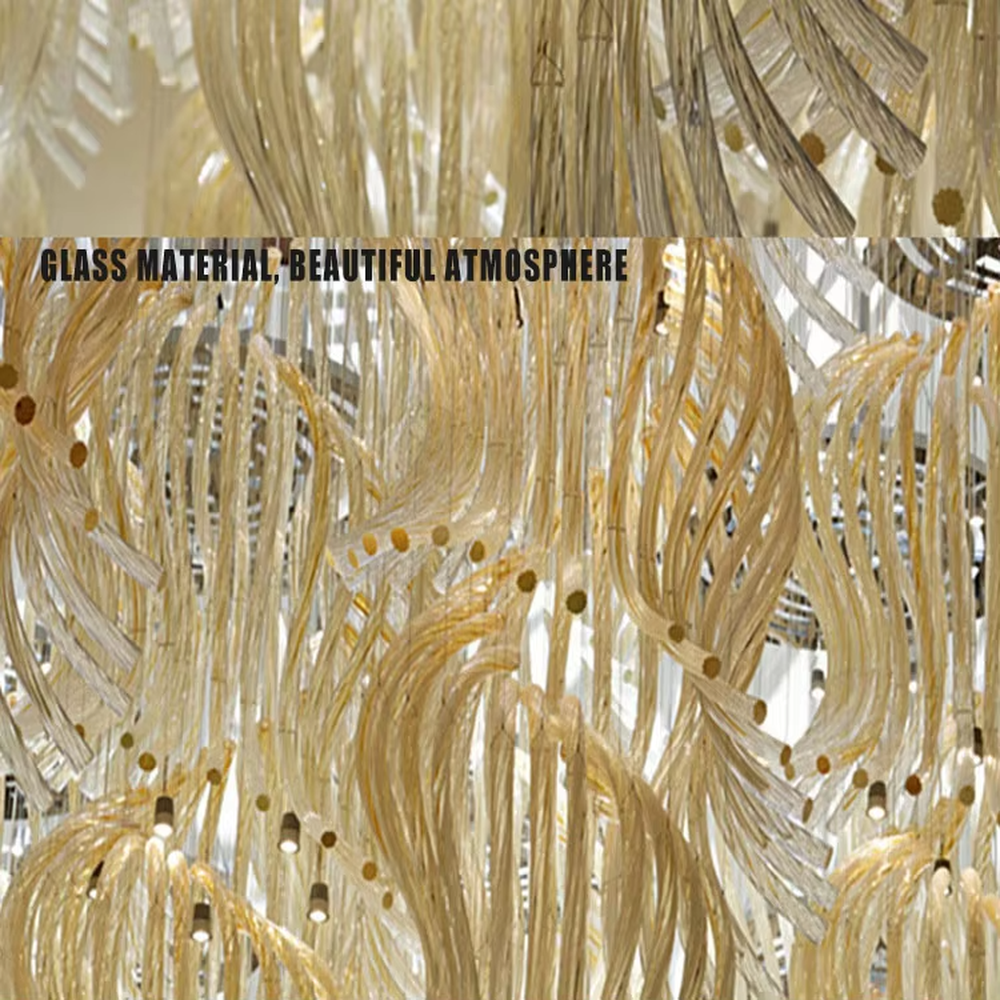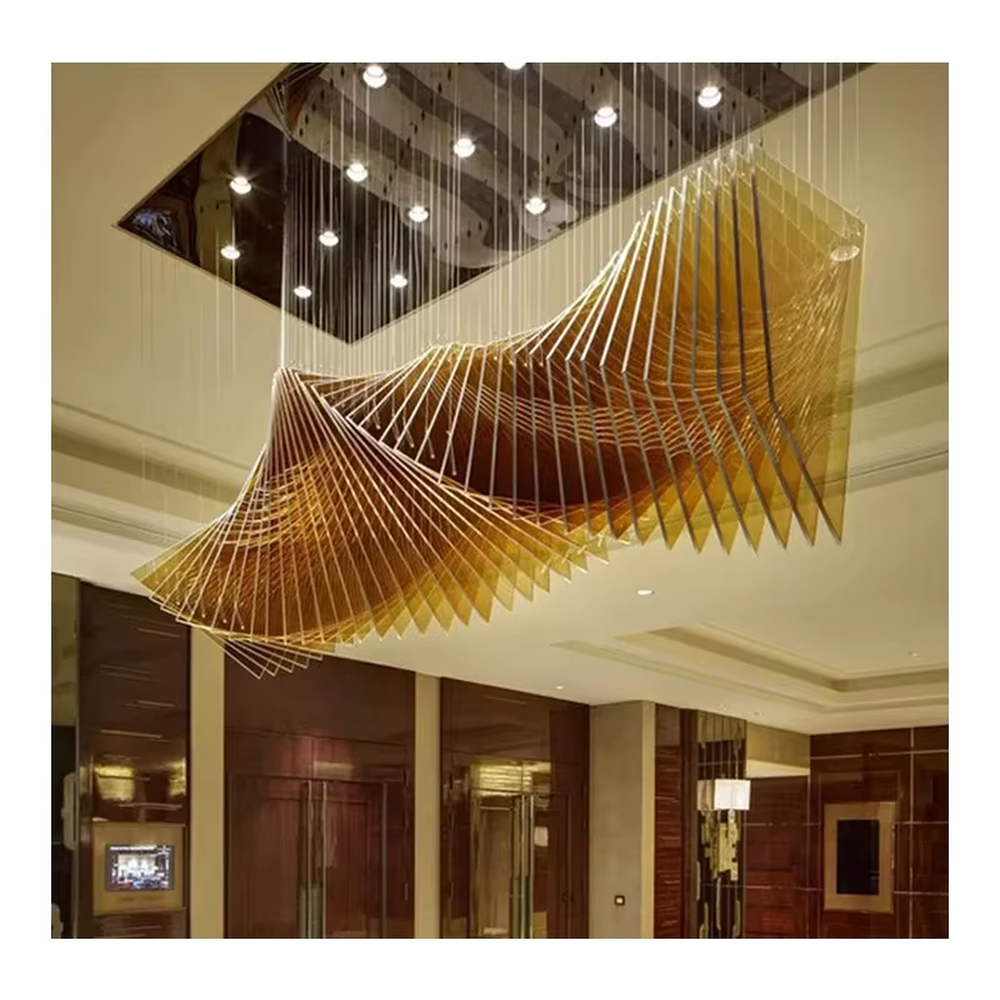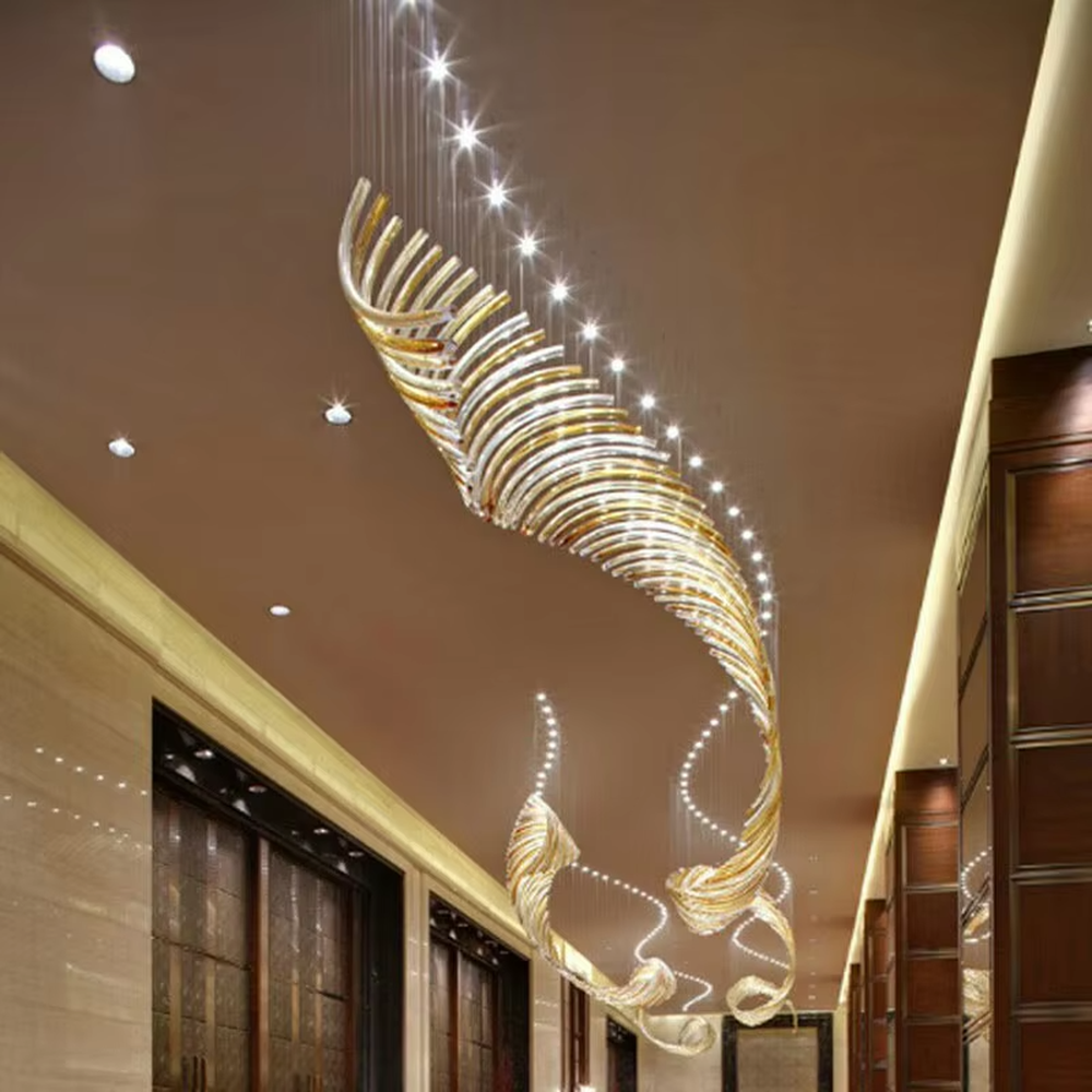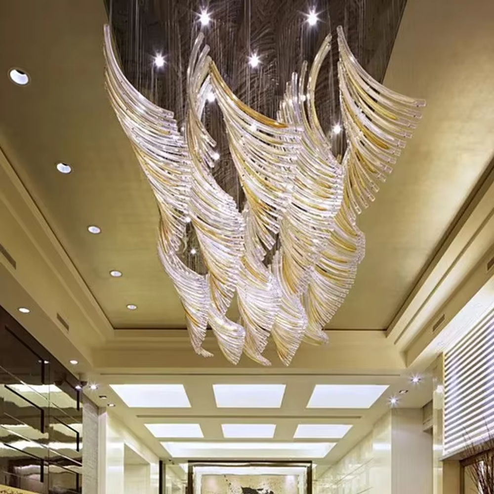 Inspired by “the vivid moment of wings flapping”, this chandelier uses transparent and gold-gradient crystal strips to create layered wing shapes, hung staggered with slender suspension rods. The whole piece looks like a group of gilded wings suspended in the space, and when light passes through the crystals, it refracts brilliant and warm light and shadow, combining luxurious texture and artistic atmosphere. It supports customization of the number of wings, curvature, and crystal gradient range according to space size, serving as both the core lighting tool for high-ceiling spaces and a visually striking art installation, infusing high-end venues with a grand and elegant luxury atmosphere.