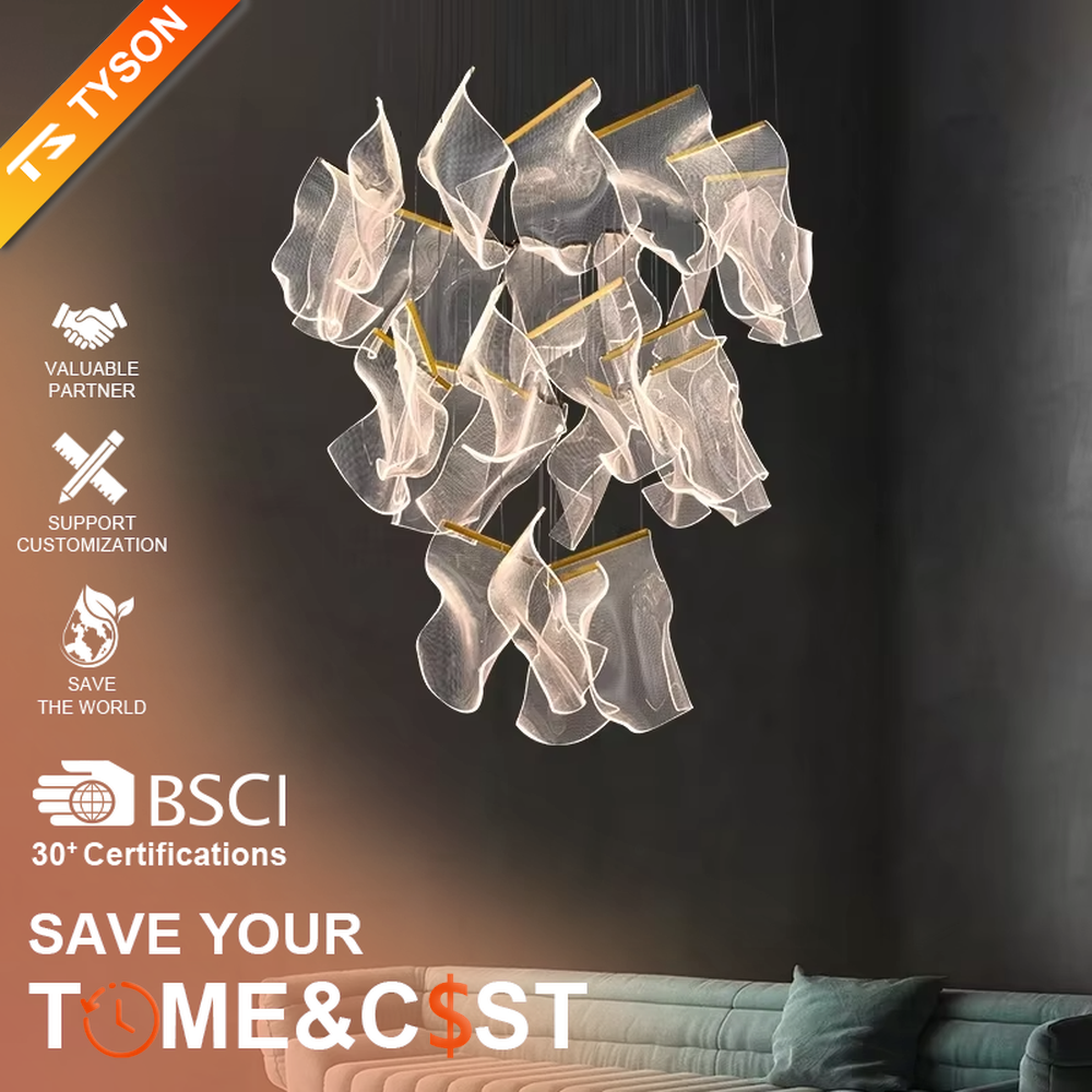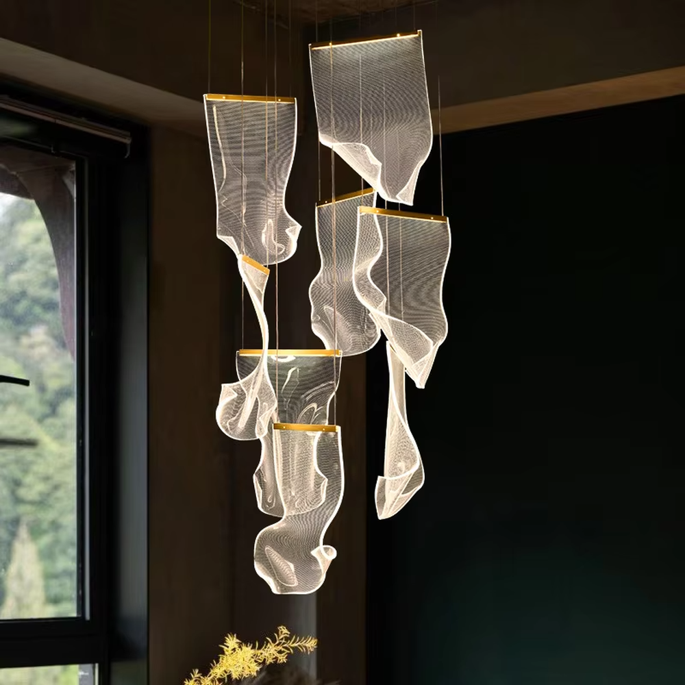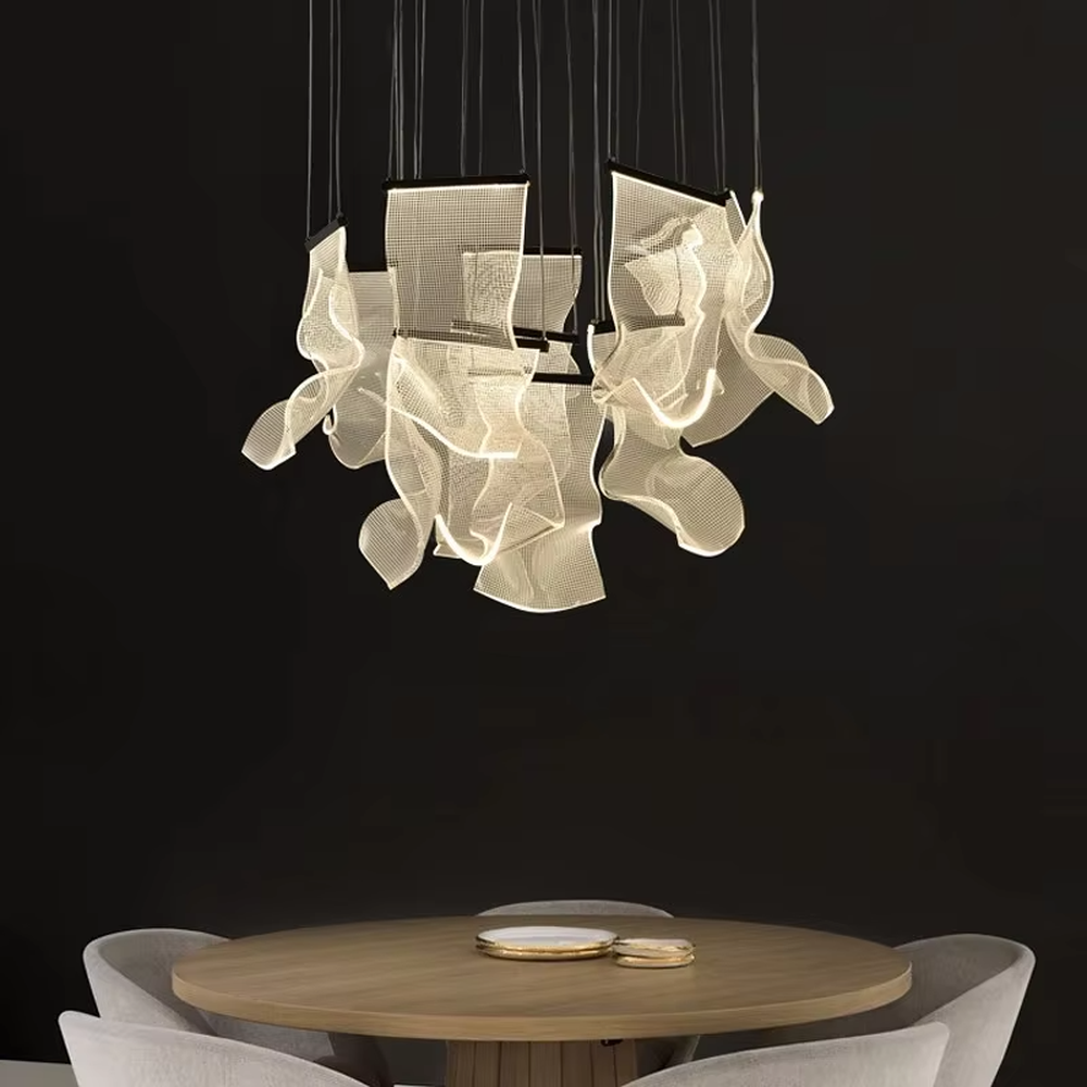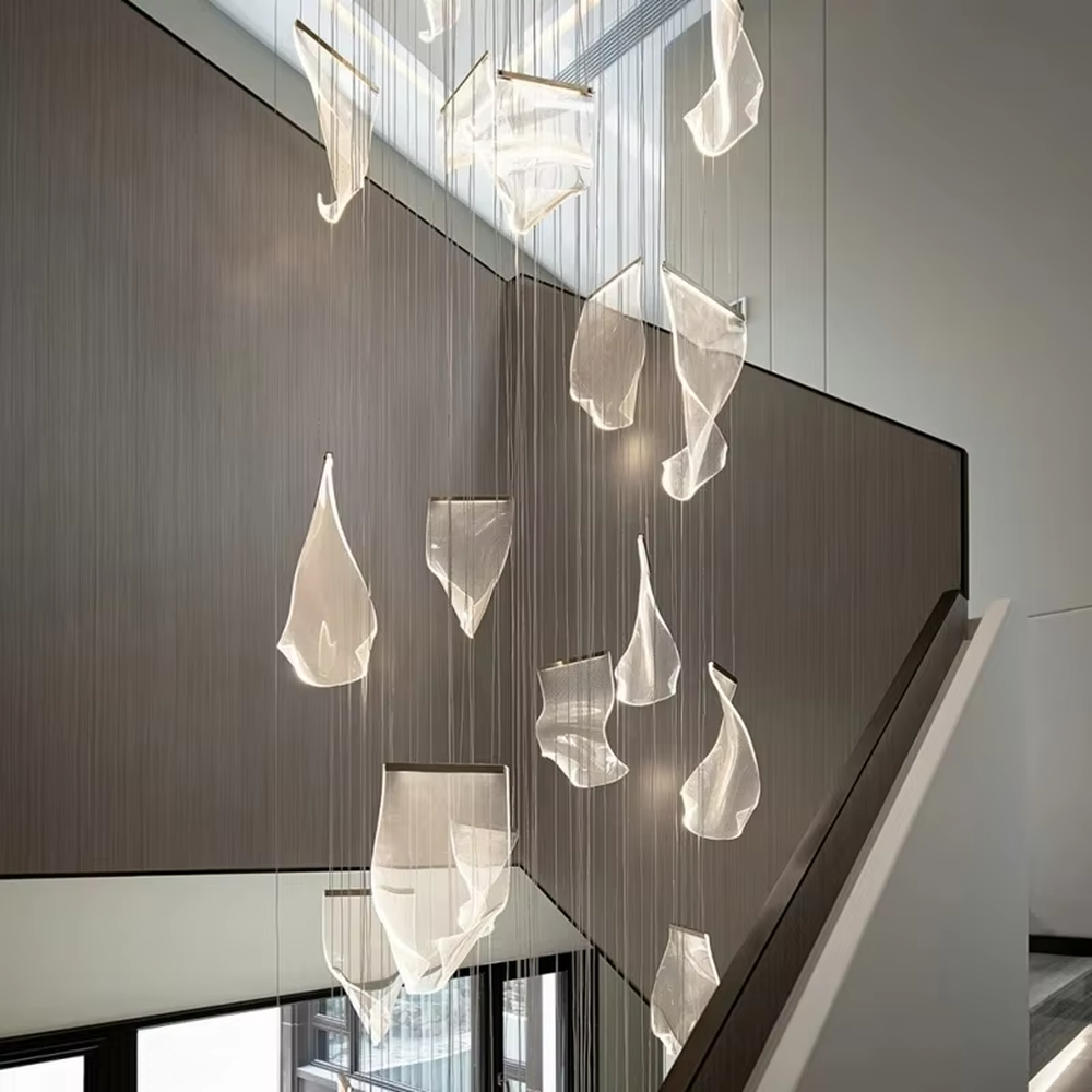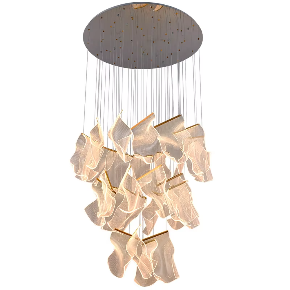 This chandelier takes light and translucent leaf-like modules as the core design elements, hanging staggered on thin suspension wires, paired with a circular ceiling plate with gold star dot decorations. The overall shape is like flowing clouds or elegant petals, softening the light while creating a dreamy and dynamic visual effect. The high-quality translucent material has both light transmission and texture, and the stable suspension wire structure ensures installation safety. It is suitable for high-end space styles such as modern light luxury and artistic minimalism, and is both a practical lighting tool and a visually striking art installation.