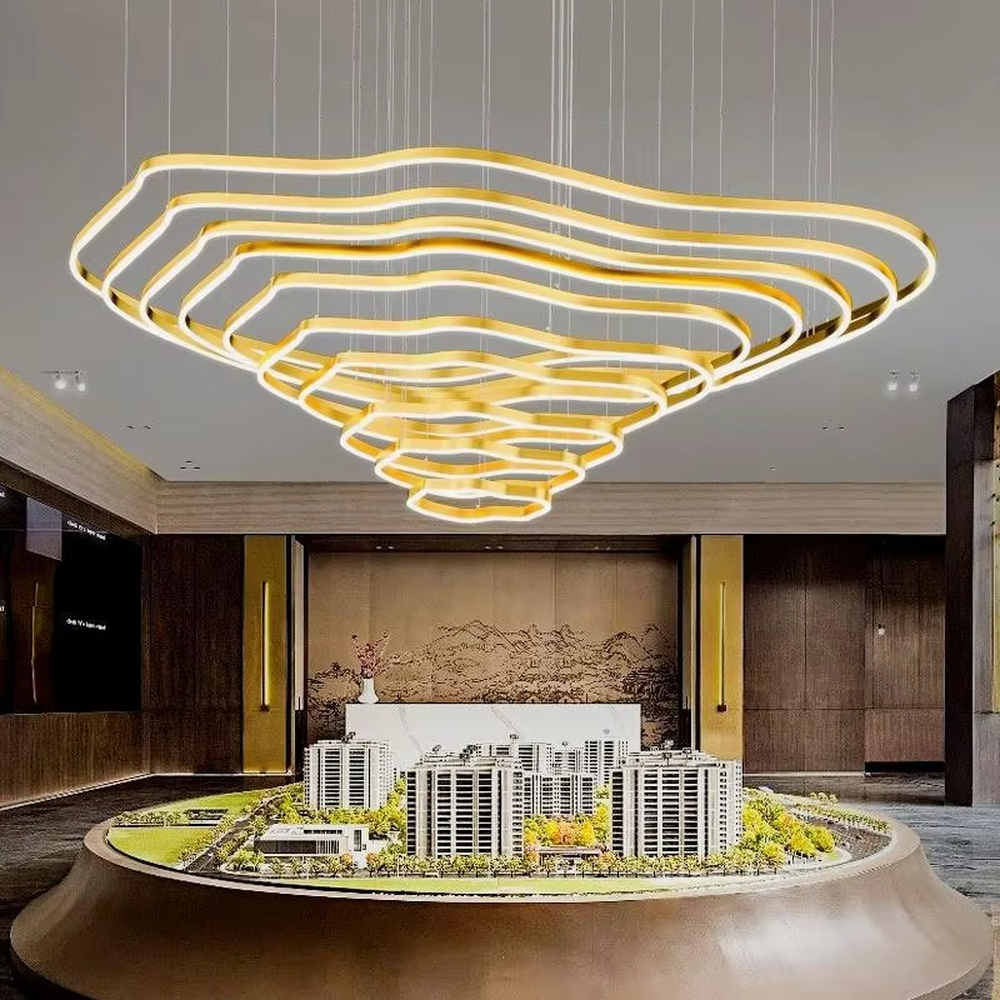 Inspired by “Oriental clouds and layered mountains”, this chandelier features multi-layer wavy LED light strips made of gold metal frames, arranged in a suspended stacked layout. The warm light is soft and transparent, like flowing clouds or undulating mountains suspended in the space. The overall shape combines new Chinese artistic conception and light luxury texture, serving as both the main lighting tool for high-ceiling spaces and a decorative core that enhances the space’s style, infusing high-end venues with an elegant and luxurious atmosphere.