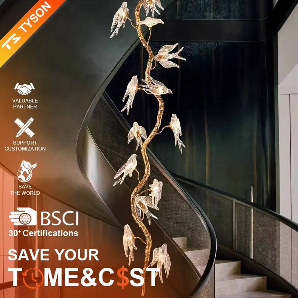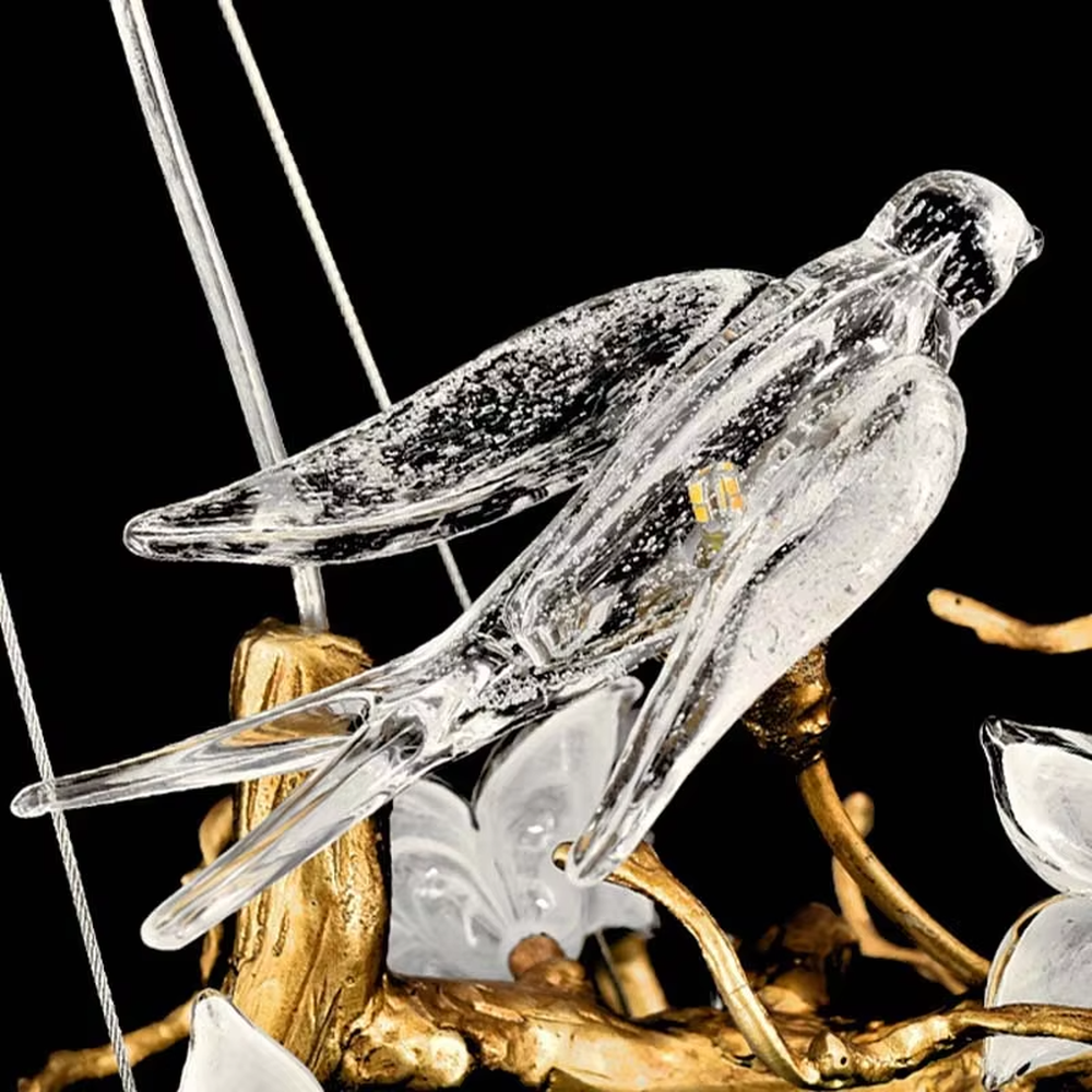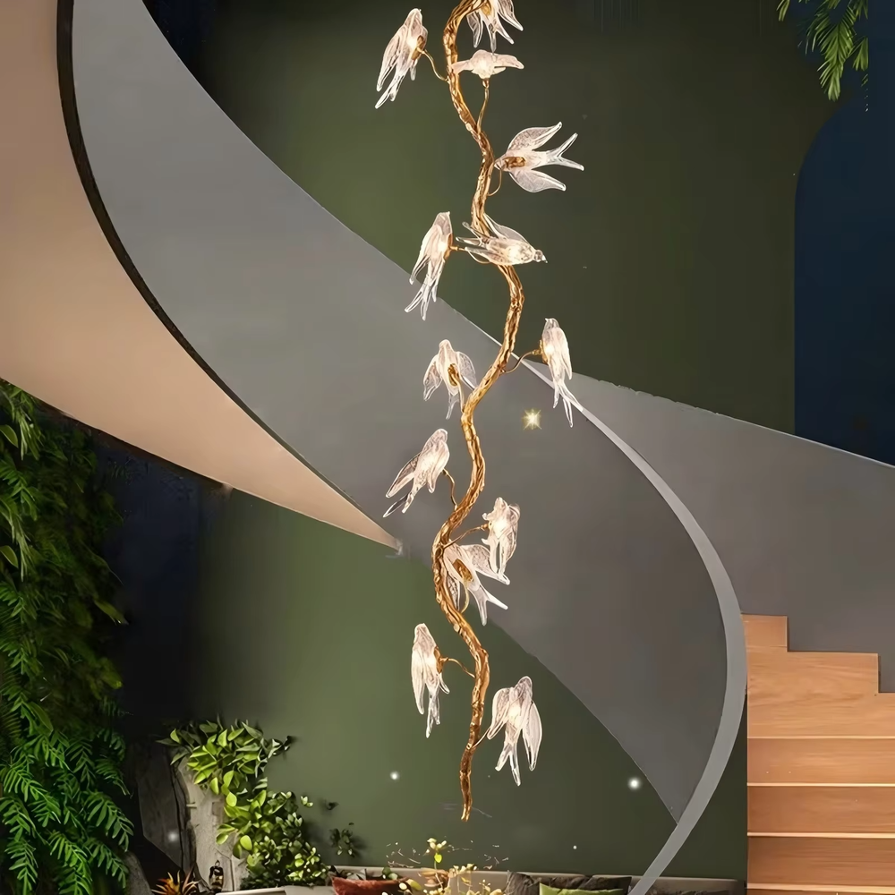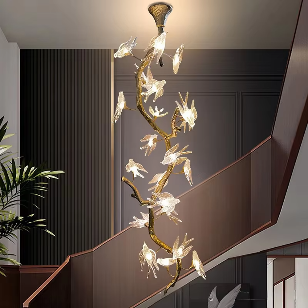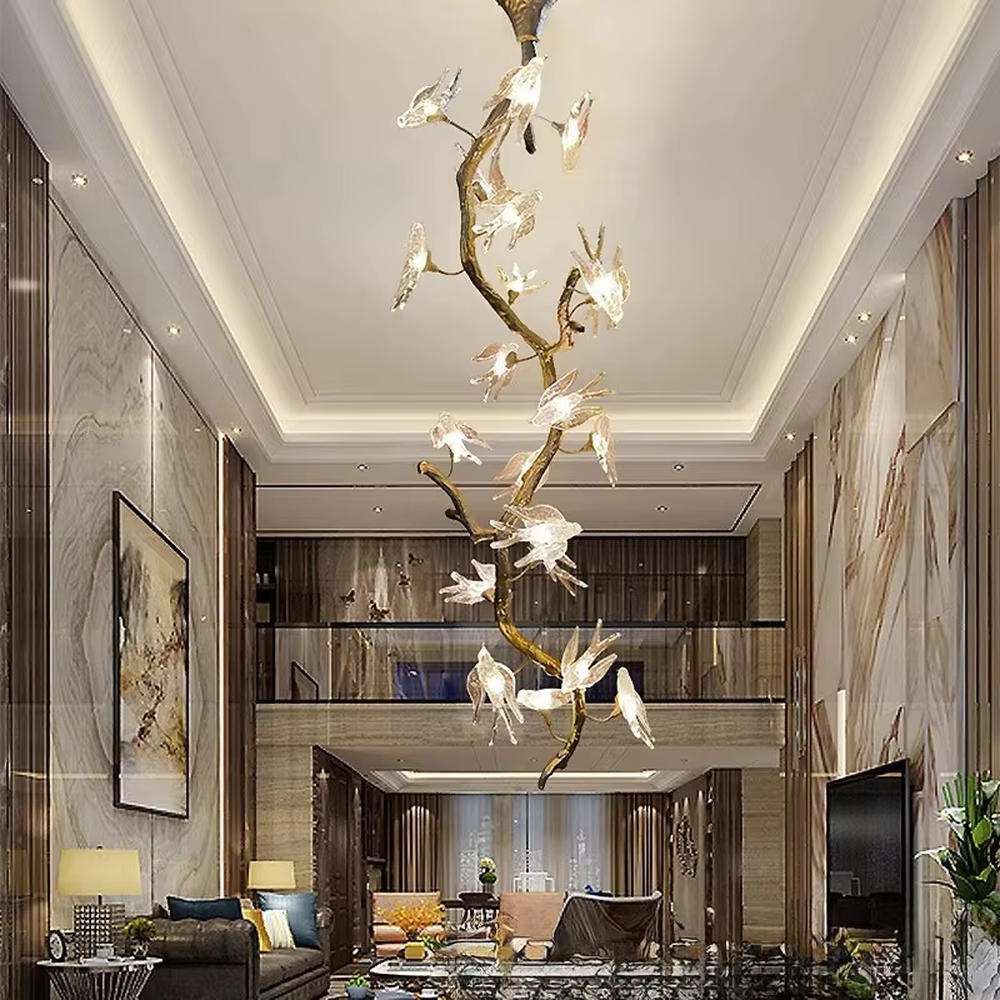 This chandelier adopts a natural art style design, with a golden dead branch shape as the bracket, paired with transparent glass bird decorations (built-in light sources), integrating natural elements with creative aesthetics; warm light emits a soft and dynamic effect through the glass birds, suitable for hanging installation in spaces such as villa high-ceiling stairwells and art exhibition halls. It is both the core visual art installation of the space and provides ambient lighting, effectively enhancing the natural creative style of the space.