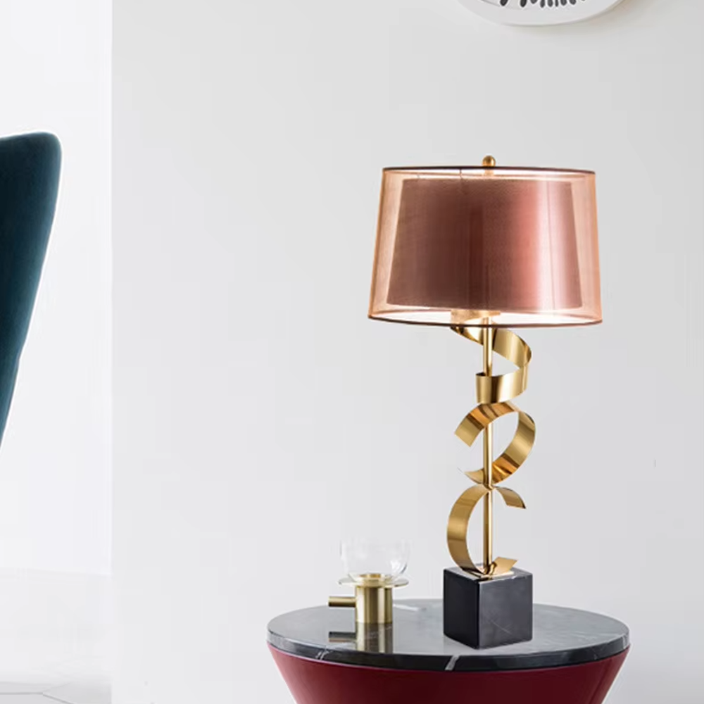 This table lamp adopts a light luxury art style design, with a golden spiral metal pole as the stand, paired with a pink-brown textured fabric shade and a dark blue base, featuring a dynamic shape and high-end texture; it is equipped with a built-in warm light source, with soft and warm light effect, suitable for placement in bedrooms, living rooms, leisure areas and other spaces. It is both a practical local lighting tool and a decorative focus that showcases artistic style, effectively strengthening the warm light luxury atmosphere of the home.