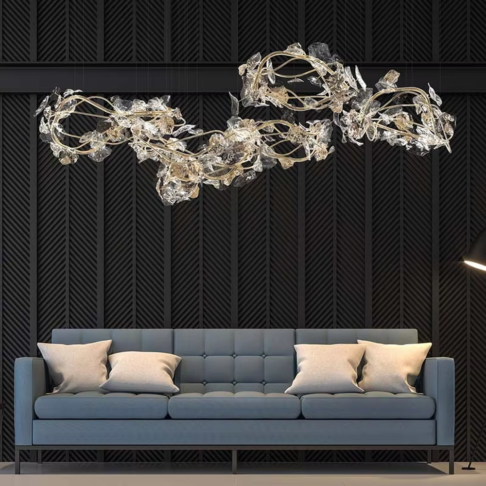 Inspired by natural vines, this chandelier features a vivid irregular frame made of gold metal, paired with transparent crystal/glass leaves. Light refracts brilliant light and shadow through the leaves, like a flowing galaxy suspended in the space. The overall shape combines natural and artistic qualities, serving as both a practical lighting tool and a visually striking space installation, infusing high-end venues with an elegant and luxurious atmosphere.
